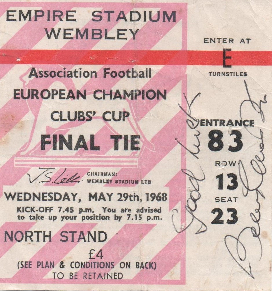 Celebrate a legendary moment in football history with this canvas shopper bag featuring the original match ticket design from the 1968 European Cup Final, where Manchester United faced Benfica at Wembley Stadium.